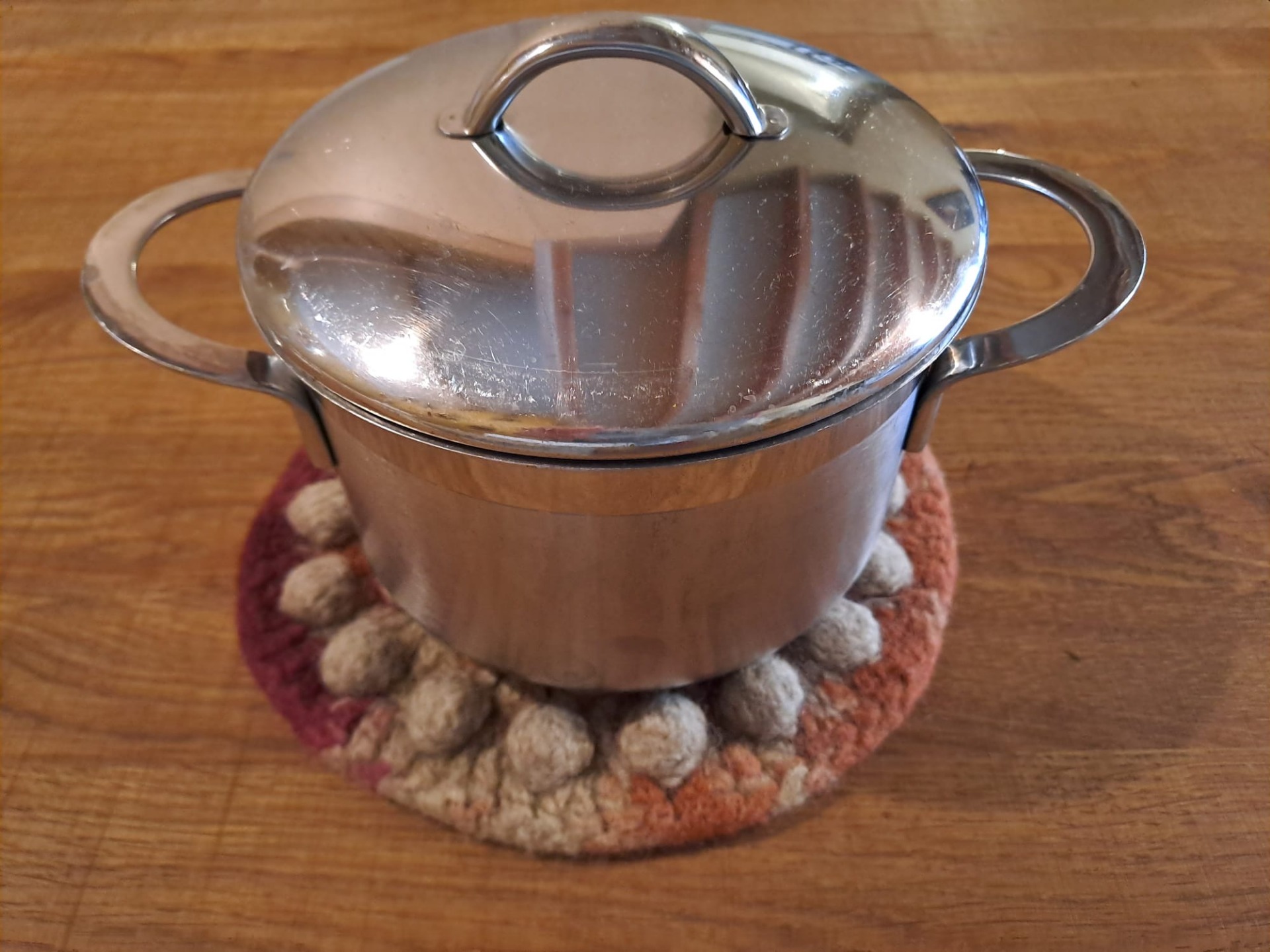 Hoe origineel zijn deze! We haken deze in een XL formaat om daarna in de wasmachine te vilten. Het resultaat is een mooie, decoratieve onderzetten voor kookpotten, bestand tot 220°